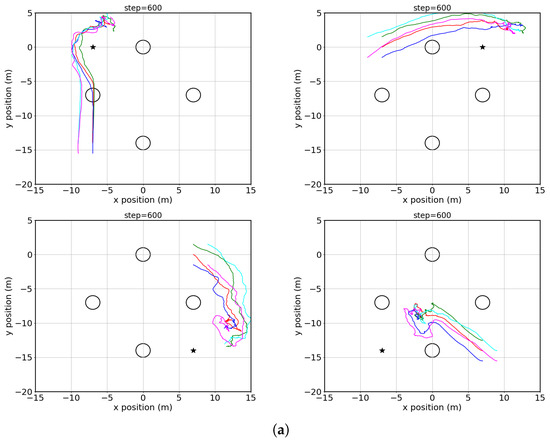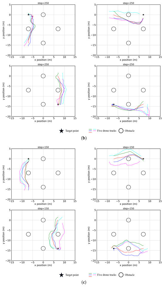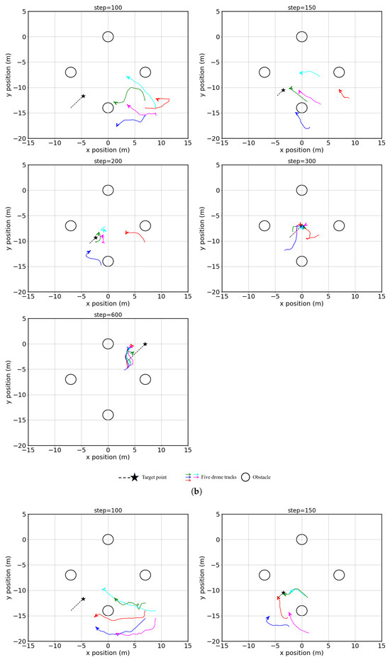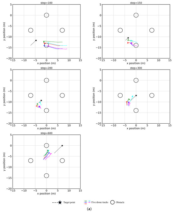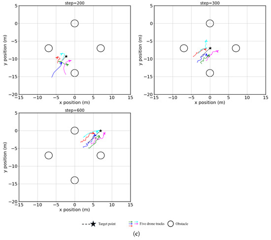 Figure 8 shows the movement trajectories of five drones and three algorithms chasing the target point in the dynamic rounding-up scene, where (a) is the test trajectory diagram of the PPO algorithm, (b) is the test trajectory diagram of the DDPG algorithm, and (c) is the test trajectory diagram of the SAC algorithm. Three of the algorithms intercepted the trajectory state diagrams when step = 100, 150, 200, 300, and 600, respectively.
