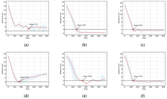 In terms of efficiency, we measured the number of steps taken by various algorithms to complete the two tasks, with each step set at 0.05 s. A shorter acquisition time indicates that the algorithm is capable of quickly identifying and rounding-up the target. Among them, we believe that a distance of 2 m from the target point represents a successful rounding-up.