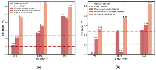 Figure 10a and Figure 10b represent the safety indicators of the three algorithms in fixed-point rounding-up tasks and dynamic rounding-up tasks: the minimum distance between drones relative to obstacles, the minimum distance between drones, and the average distance between drones, respectively, where (a) is a fixed-point roundup task. Both the DDPG algorithm and the SAC algorithm can achieve the purpose of safe obstacle avoidance and collision prevention, while the UAV collides with obstacles under the PPO algorithm. (b) represents the dynamic round-up task, in which only UAVs under the SAC algorithm can safely avoid obstacles. UAVs operating under both the DDPG algorithm and the PPO algorithm are at risk of colliding with obstacles or aircrafts.