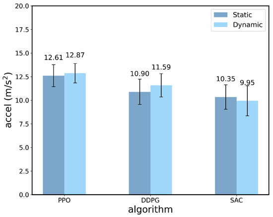 Figure 11 represents the average acceleration of the UAV swarm for the two tasks controlled by the three algorithms obtained after running the strategy 20 times. Comparing the three algorithms, it is obvious that whenever there is a fixed-point rounding-up task or a dynamic rounding-up task, the average acceleration of the UAV group under the SAC algorithm is the smallest; that is, the energy consumption is lower than the other two algorithms.