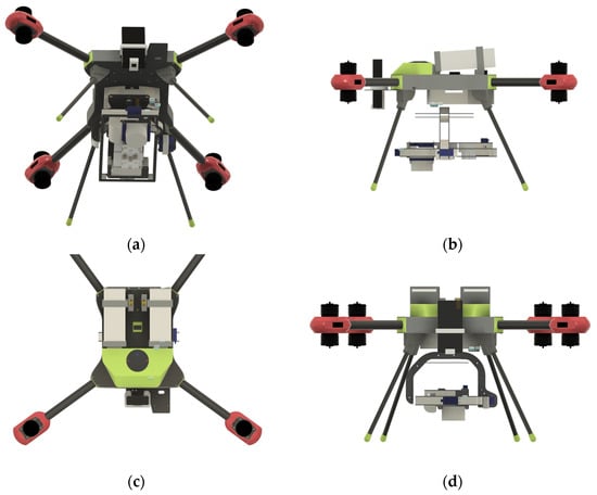 Drone view: (a) bottom view, (b) side view, (c) top view, and (d) front view.