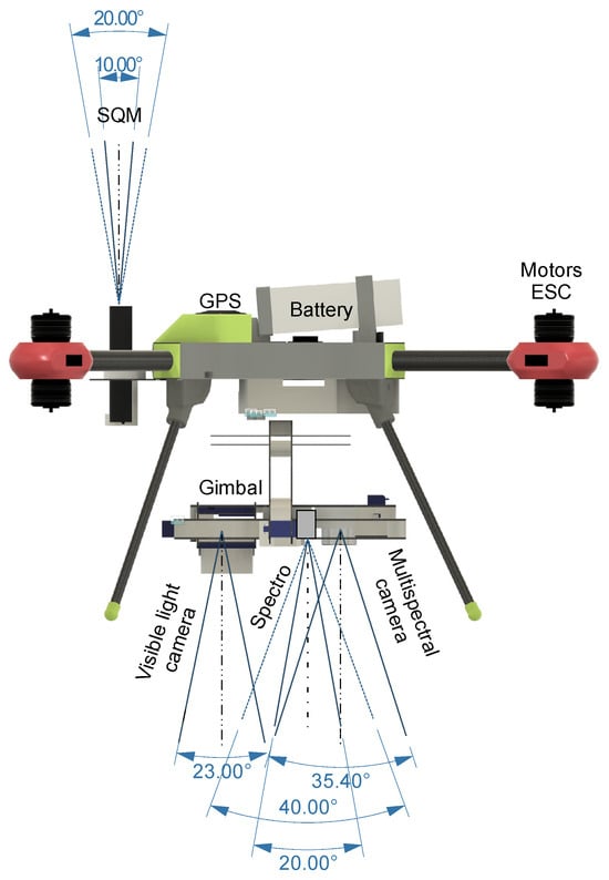 The measurement equipment (Figure 2), or in other words, the functional payload of the drone, is a number of different sensors designed to measure the light spectrum, both point-wise and over a certain area (Figure 3). Since the result of the measurements is a spatial map of the intensity and light spectrum in the area, two cameras are provided for this purpose—a visible light camera and a multispectral camera, which are placed on a common gimbal. The gimbal has been designed so that both cameras fit on a single structure, which ensures the constant mutual position and orientation of the two cameras. The two cameras are connected to the flight computer (FC) and are released according to the flight plan from pre-designed positions. The total weight of the mounted sensors is 1100 g. The recommended functional payload weight for the presented drone is 1500 g (the maximum allowable payload weight is 4000 g). The platform therefore still has a significant reserve of loading capacity, which allows for additional development and adaptation of more sensors. A summary of the measurement sensors and the data acquired, together with the units, is shown in Table 1.
