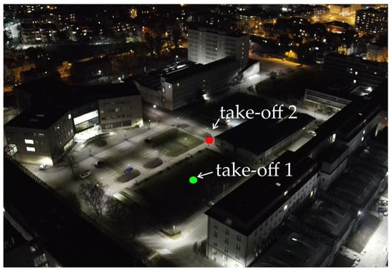 The second research flight was a flight along a pre-programmed route at an altitude of 100 m, with the take-off point in a dark position (take-off 1 in Figure 4). The purpose of this phase of the research was to mobile measure the SQM values in the study area. The third test flight was a vertical ascent at 200 m above ground level (AGL) in a fixed position with the take-off point located under a street lamp (take-off 2 in Figure 4), in a location illuminated by it.