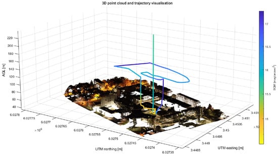 Figure 5 simply visualises the trajectory that the UAV has travelled during the flight and the colour-coded scale marks the readings of the SQM values during the different phases of the flight. The point cloud that forms the background of the figure was created as a result of a photogrammetric process based on the data collected in flight 1. As can be seen in this figure, the point cloud was generated correctly, and the colour of the individual points in the cloud makes it possible to locate the sources of illumination and the position of areas illuminated by a given light source. In parts where the illumination is insufficient, the point cloud is not generated, so it can be considered that the illumination of these regions is minimal. The research trajectory from the dark take-off (take-off 1) was over the streetlights at a height of 100 m. Significantly, the SQMs from the dark take-off already exceeded 16 mag/arcsec2, which cannot be said for the take-off (take-off 2) at the streetlight-illuminated site. In the case of a take-off from an illuminated location, the SQM values were above 14 mag/arcsec2, indicating a clear influence of the illumination on the instrument readings. From this, it follows that the SQM data must be considered in the context of the flight altitude. At low altitude, interference is introduced by artificial sources of illumination, so the measurements will be distorted. At a certain flight altitude, the SQM values fix at a certain value, which allows the quality of the sky to be objectively assessed.