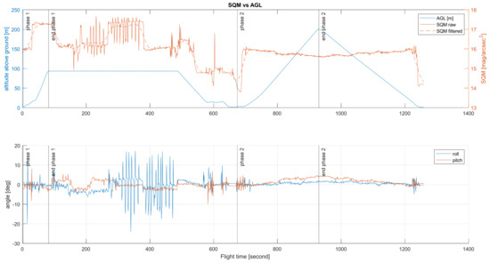 Figure 6 shows the synchronised recording of the SQM values versus the flight altitude and the UAV’s momentary roll and pitch.