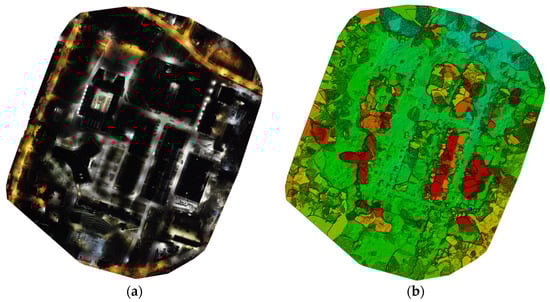 Figure 9 presents an overview of the nighttime orthophoto map and the numerical terrain model extracted from the nighttime images. As can be seen in the images shown, the designed shutter speed settings and the drone’s hovering performance allowed the acquisition of images without significant blur. These images allowed the production of a night orthophoto map and a digital surface model (DSM) of the study area (Figure 9). The nighttime orthophoto map allowed an inventory to be performed of the lighting sources and visualised the illumination of the study area in a way that is as accessible to the human eye as possible. The DSM is not correct and should not be developed on the basis of nighttime images. In areas where there is complete darkness, e.g., building roofs, terrain elevation data are not calculated. The numerical terrain model must be acquired during daytime photography.