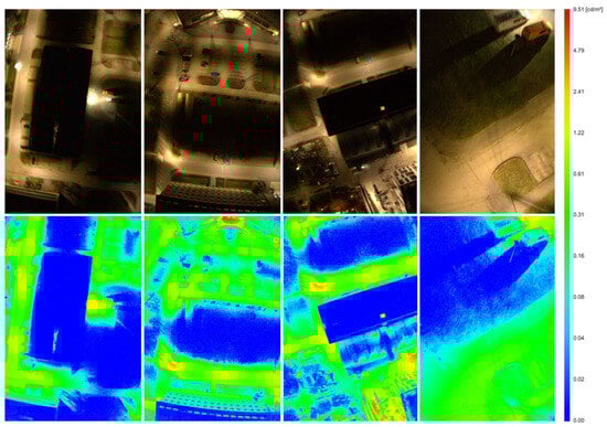 Images acquired with a visible light camera mounted on a drone (top row—raw data, bottom row—data indicating luminance level (cd/m2) after post-processing with iQ Luminance software).