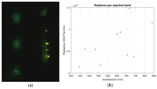 Figure 11 presents the composite image created from three spectral channels sequentially R (red 668(10) nm), G (green 560(20) nm) and B (blue—475(20) nm), as well as the radiance values for the indicated measurement point recorded in all ten spectral channels. The composite image was aligned and geometrically transformed based on the data contained in the spectral camera metadata.