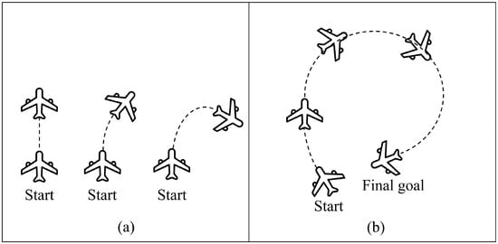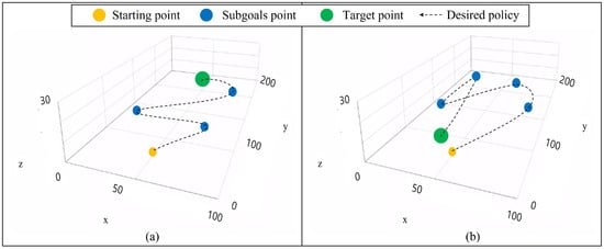 In this section, we describe an approach for controlling the UAV to various locations to perform real-time path planning. The primary aim of this study is to enable the agent to arrive at any desired spot, regardless of location. It is assumed that the agent can arrive at any point if it can be guided by subgoals that are set to encourage reaching the final goal. In earlier studies, there were limitations to the number of goals an agent could reach or tasks it could perform. However, our suggested approach seeks to enable the agent to accomplish the goal via multiple subgoals, wherever subgoals exist. There is one recent study on reaching the target point, which exists in front of the UAVs via subgoals, as shown in Figure 3a [36]. However, there have been no studies that maneuver to return to the final target near the starting point by bypassing subgoals. To achieve fully controllable UAVs, we combine goal-conditioned RL and curriculum learning. The agent in goal-conditioned RL can accomplish its final goal through subgoals. We intend to enhance the learning efficiency of RL by implementing goal-conditioned RL. This approach enables the agent to implement the targeted policy under the given environment. When the agent acquires knowledge of the subgoals, it can be guided to accomplish the final goal by carrying out those subgoals. Consequently, the UAV agent can successfully attain the goal by reaching many user-defined sub-points.