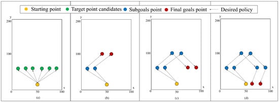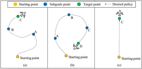 The UAV agent can employ subgoals to get to the target through the first stage utilizing goal-conditioned RL. Suppose the agent needs to reach point C, as shown in Figure 3a. The transitions split into several segments with subgoals as the UAV agent nears the final goal. Then, the agent transits to the nearest subgoal and is guided to reach the final target by completing these intermediate missions. Consequently, the agent can carry out the various maneuvers with subgoals and complete tasks in front of the agent.