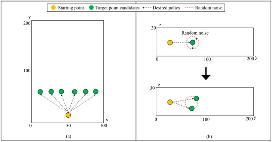 The example of goal candidates of the UAV in the first stage. (a) Top view of the goal candidates. (b) Side view of the goal candidates with an example of random noise.