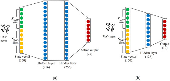 Since the introduction of deep neural network (DNN), RL has evolved into deep reinforcement learning (DRL) through the integration of deep learning architectures. While traditional RL uses tabular methods or simple function approximators, DRL leverages DNNs to handle high-dimensional state spaces and learn complex feature representations directly from raw input data. This advancement has enabled RL to tackle more challenging problems in robotics and control [8,9,10,11]. Recent studies have shown remarkable progress in applying DRL to UAV control, particularly in handling wind disturbances [12] and achieving reliable tracking control [13,14]. DNNs excel in acquiring high-level features, and this property leads agents to learn the desired policy in high dimensional state space. These techniques offer the benefit of using the agent’s varied experiences to choose the most effective strategy in an uncertain environment. As a result, recent DRL-based methods have played a leading role in the progress of autonomous path planning [15,16,17].