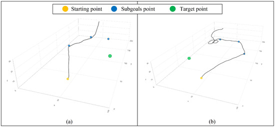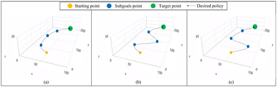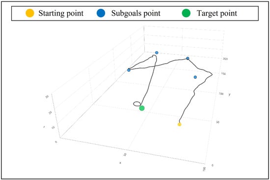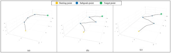 We set several scenarios during the test phase to validate the ability of the UAV agent to plan a real-time path. We devised three to four subgoals for each scenario and verified the agent’s ability to achieve both the subgoals and the final goal. The agent does not know the information about the subgoals beforehand. When being provided with the subgoal while in flight, the agent updates its state to correspond with the present location of the UAV with the subgoal. The final goal was established under two conditions: significant distance from or close to the initial point, which the agent has not previously visited during the learning. In the first scenario, both the subgoal and the endpoint are located far from the agent’s starting point. Figure 8 shows the three cases of the first setting.