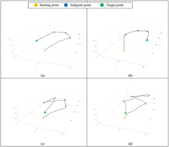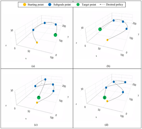 The trajectories followed by the UAV agent utilizing the suggested method in the second test phase scenario are presented in Figure 13. The agent reached the final goal and passed the subgoals successfully. With curriculum learning, the agent could perform complex behaviors like round-trips and had a high success probability in all cases. In addition, it is notable that agents successfully perform more challenging missions than a round-trip. Figure 13c,d show that the agent can perform tasks that involve moving in multiple directions. The agent successfully performed two sharp directional changes and reached the final goal. The result of the second test phase demonstrates that through our proposed method the UAV agent can perform a variety of tasks without additional training by task.