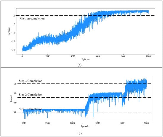 The learning curve in the training environment. (a) The learning curve during the first training phase. Upon reaching a total of 60,000 episodes, the UAV agent accomplished its subgoals. (b) The learning curve of the second training phase. The UAV agent started accomplishing all four subgoals when the episode reached 185,000.