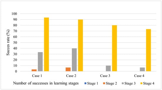 The bar chart shown in Figure 14 shows the percentage of the agent reaching the subgoal by stage of curriculum learning in the second test scenario. The first stage indicates the baseline model with no curriculum learning. To evaluate the agent’s likelihood of achieving subgoals, we considered it successful if the distance between the agent and the subgoal was less than 2 km. We established the criterion for success as the agent achieving the final goal after completing all subgoals. The success ratio for each subgoal the agent achieved in 30 tries was then calculated. The agent trained without curriculum learning does not complete the mission in all cases. Even when the agent performs relatively easy tasks in the second scenario, such as cases (a) and (b), it fails to succeed.