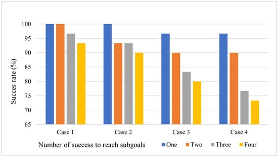 Figure 15 depicts the ratio of the fully trained agent with our proposed method reaching subgoals in the second test scenario. It was observed that the probability of reaching subgoals decreased as the number of subgoals to be reached increased. In addition, cases (c) and (d), which are more difficult, have a relatively low probability of success. With our proposed method, we can observe that the agent succeeds in the turning maneuver with a probability of more than 90% regardless of the number of subgoals. Moreover, the agent successfully performs a complex maneuver requiring it to simultaneously perform clockwise and counterclockwise movements, such as cases (c) and (d).