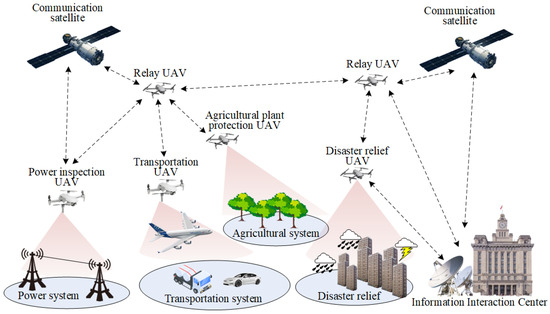 The communication of unmanned aerial vehicles (UAVs) constitutes a crucial part of the UAV technology system. Possessing advantages like mobility, stability, and extensive coverage, they can act as an aerial base station or relay node to aid ground communication. As an important means of information gathering and data transmission, UAVs are widely applied in both military and civilian domains. As shown in Figure 1, UAVs, with their unique advantages, can achieve long-distance wireless data transmission (remote sensing and remote control via satellite as an intermediary) in multiple scenarios (such as power inspection, disaster relief, etc.), promoting the process of information interaction and information collaboration. However, the emergence of a large number of users in the airspace network has promoted the continuous development of intensive applications. This, in turn, has led to mutual occupation and interference of communication frequencies, seriously impacting the communication quality of UAVs. Therefore, in the crowded electromagnetic spectrum space, improving the utilization rate of the electromagnetic space spectrum and reducing the probability of spectrum conflicts are of great significance for promoting the rapid development of UAV communication technology.