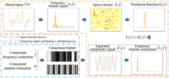 As shown in Figure 2, the overall flow of the frequency detection method is based on sparse feature signal reconstruction. This process is composed of two parts: signal separation and component number and frequency estimation. In the signal separation process, for the mixed signal , Fourier transform and sparse feature extraction are performed in sequence. According to the sparse feature , the nonlinear mapping relationship from to is constructed to achieve signal separation. During the process of component number and frequency estimation, feature extraction is performed on each component signal in the mixed signal, respectively. Eventually, the estimation of the number and frequency of component signals is completed.