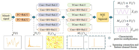 The signal separation network uses the autoencoder network as its backbone. The encoder extracts the sparse features of each component signal in the mixed signal. The decoder then constructs a nonlinear mapping function based on these sparse features to separate each component signal. As shown in Figure 3, the network design is as follows. The signal separation network transforms the mixed signal to the frequency domain through two fully connected layers, and its frequency domain representation is . Then, multiple convolutional layers and pooling layers are cascaded to construct the encoder and perform downsampling processing on to obtain the sparse feature of . The decoder is composed of multiple convolutional layers and deconvolutional layers. It performs upsampling and reconstruction on . Through the Spatial Group-wise Enhance (SGE) module [36], the features of each component signal are grouped. The similarity between local and global features is utilized to generate an attention mask for realizing the construction of the nonlinear reconstruction function in the frequency domain of each component signal.