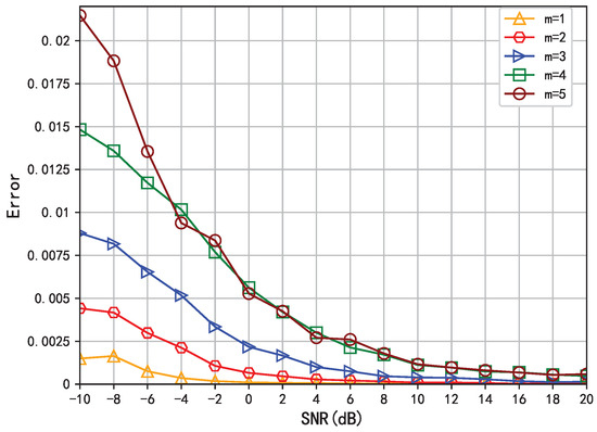 Figure 6 presents the separation error of the SFsRNet method for the mixed signal under different numbers of components. It can be clearly observed from the figure that, except in the low signal-to-noise ratio (SNR) region where the influence of noise energy is relatively significant, resulting in a few minor fluctuations in the error values, on the whole, the error values show a decreasing trend as the SNR increases. When dB, the error value is less than 0.0057. When dB, the error value is less than 0.0012. When dB and , the signal separation error values are relatively close. This indicates that the SFsRNet method is less influenced by the number of components under this condition and has a relatively stable separation effect.