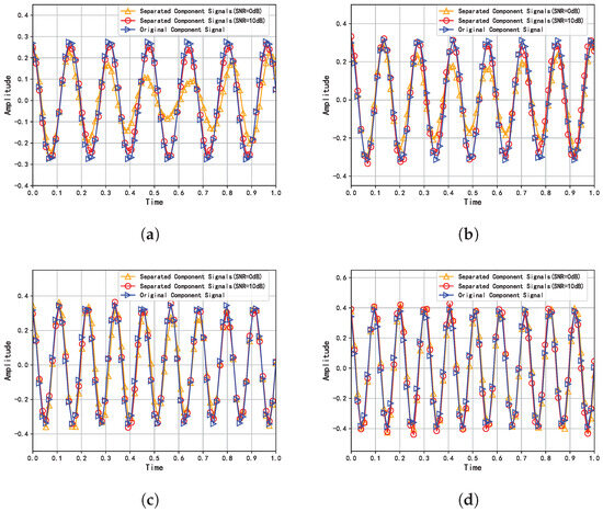 Comparison of the Time Domain Characteristics Between Separated and Original Sub-Signals. Panels (a–d) illustrate the separation results of individual component signals from the mixed-signal. Each component signal exhibits distinct amplitude, phase, and frequency characteristics. The blue right triangle denotes the original signal, while the yellow upward triangle and the red circle represent the separation results under signal-to-noise ratios (SNR) of 0 dB and 10 dB, respectively.