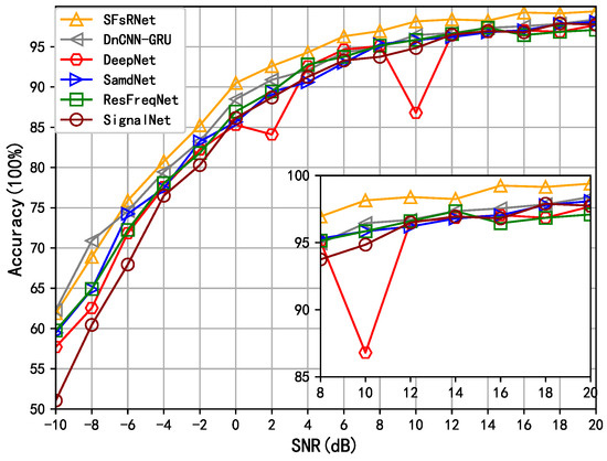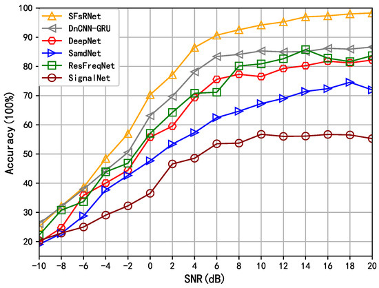 Table 10 presents the average frequency detection accuracy rates of the above six methods under different numbers of components when dB. The average frequency detection accuracy rates of SFsRNet under different numbers of components are 96.43%, 92.88%, 87.9%, and 87.61%, respectively, which are 2% to 29.91%, 9.62% to 43.66%, 7.02% to 45.79%, and 13.15% to 50.56% higher than those of the other five methods. From this, it is evident that SFsRNet boasts a relatively high detection accuracy rate under diverse numbers of components. Furthermore, as the quantity of components grows, the superiority of this method becomes increasingly prominent.