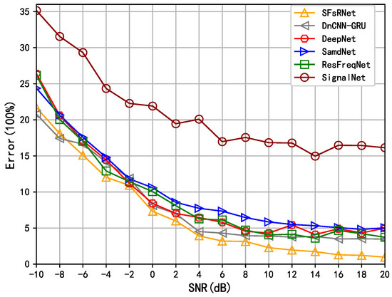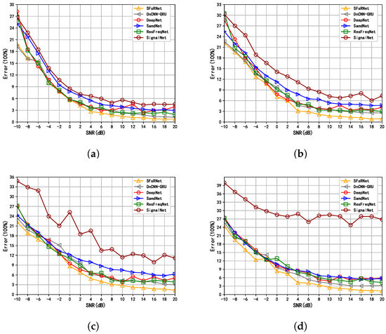 Figure 9 presents the detection errors of the frequencies of each component in the mixed signal by the above six methods under validation set 1. As can be directly observed from the figure, when , the detection error of the component frequencies by SFsRNet is lower than that of other methods.