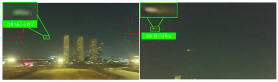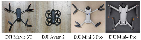 During capture, the visible light video resolution is set to 1920 × 1080 pixels, and the infrared video resolution is set to 640 × 512 pixels. Both the visible light and thermal infrared cameras have a frame rate of 30. The drone targets used for capture are DJI Avata 2 (SZ DJI Technology Co., Ltd., Shenzhen, China), DJI Mini 3 Pro (SZ DJI Technology Co., Ltd., Shenzhen, China), and DJI Mini 4 Pro, (SZ DJI Technology Co., Ltd., Shenzhen, China) as shown in Figure 1. The DJI Avata2 drone is predominantly black in color and relatively small in size, while the DJI Mini3 Pro and DJI Mini4 Pro are predominantly white in color with slight differences in appearance.