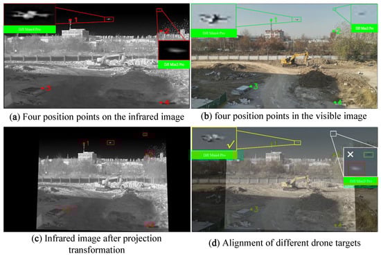 Challenge in image alignment. We attempt to use projection transformation for alignment, but due to the different depth of field in this scene compared to typical remote sensing images, conventional alignment methods cannot achieve global alignment. Under the same depth of field conditions, affine transformation or projection transformation can be used for alignment. However, in the aerial visual drone target detection scenario, the depth of field of each drone target and background is inconsistent, making global alignment impossible. As shown in Figure 5, the Figure 5a,b illustrate the selection of four corresponding points in each modality image. Additionally, the target is annotated with a red box in the infrared image and a green box in the visible light image. Based on these four corresponding points, the homography matrix is calculated, and the infrared image is transformed using the homography matrix to obtain the projected infrared image, as shown in Figure 5c. Figure 5b is then overlaid with Figure 5c to obtain Figure 5d. After transformation, it can be observed that the four corresponding points are all aligned, but the drone targets may not all be aligned: the yellow box indicates aligned drone targets, while the white box indicates drone targets that are not aligned between the two modalities.