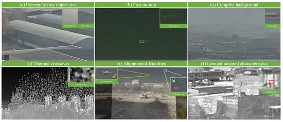 Figure 6 shows some undetected targets. Compared to existing drone detection datasets, TMRGBT-D2D is more challenging and difficult. The extremely small target size and significantly fewer visual cues impose severe constraints on feature representation learning, leading to high rates of missed detections and false alarms, as shown in Figure 6a. Additionally, TMRGBT-D2D includes scenarios where drone movement causes motion blur, particularly under low-light conditions, where motion blur is more pronounced, severely impacting detection performance, as shown in Figure 6b. However, rapid movement has minimal impact on infrared imaging, and how to fuse infrared and visible light features under such conditions remains an area for further research. In TMRGBT-D2D, due to the different shooting angles of drones, the background of the target drone in the forward and up perspectives is typically buildings, ground, forests, etc., as shown in Figure 6c. This results in a highly complex background for the target, and the extremely small target size further complicates the accurate detection of targets in complex backgrounds. Figure 6d illustrates the thermal cross-talk phenomenon present in the infrared images of TMRGBTD2D. In the figure, the infrared radiation intensity of the drone target is extremely close to that of the branches in the background. The “color” or “gray value” of the region where the drone is situated is nearly identical to that of the surrounding background, rendering it visually indistinguishable from the background. As a result, the thermal features of the drone become less prominent. This phenomenon becomes more pronounced under factors such as extended distances, complex backgrounds, or atmospheric attenuation. It is one of the inherent physical limitations of infrared detection technology. Figure 6e shows that when using projection transformation for registration, due to inconsistent depth of field (DoF) among drone targets and background, the monotonic transformation can only align frames within a fixed DoF, unable to achieve global registration. Figure 6f shows that in TMRGBT-D2D, drones are typically small targets, and infrared image resolution is limited, resulting in limited target features (edges, shape, texture).