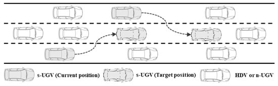 Since the preceding vehicle of an s-UGV may dynamically change (it could be another s-UGV, an n-UGV, or an HDV) due to lane-changing maneuvers, the binary variables and are introduced to capture lane assignment and downstream relationships. Thus, the safety constraint is reformulated into two cases: