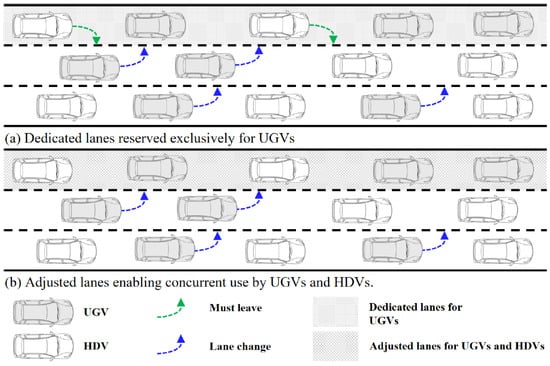 APF assumes stochastic arrivals and formations, with performance highly dependent on the market penetration rate (MPR). Although platoons may easily dissolve under dynamic conditions, APF has been extensively studied. Jiang et al. [] and Chang et al. [] examined its influence on capacity and stability, while Zhou et al. [] showed that higher UGV penetration can increase overall flow but amplify randomness due to HDV interference. Lane-based simulations [] further revealed that UGV-dedicated lanes can outperform APF, improving capacity by up to 25%.