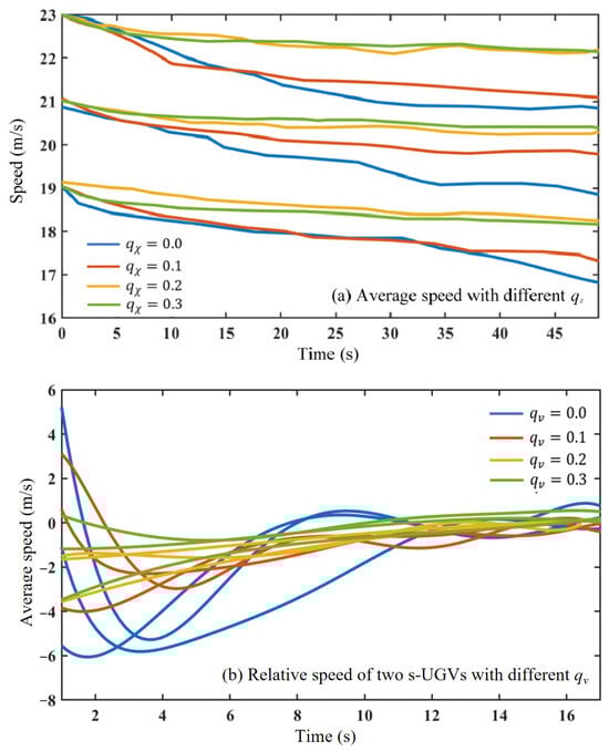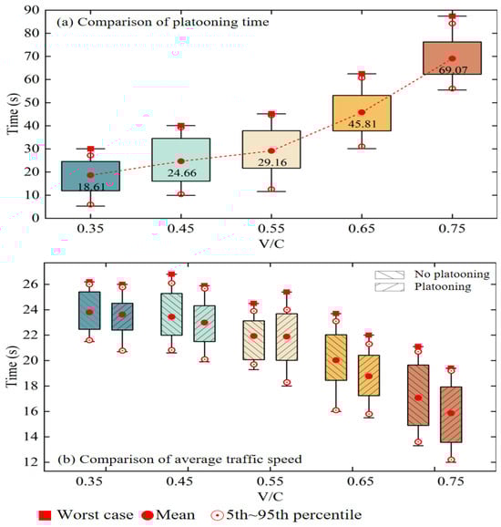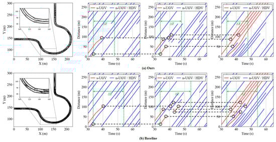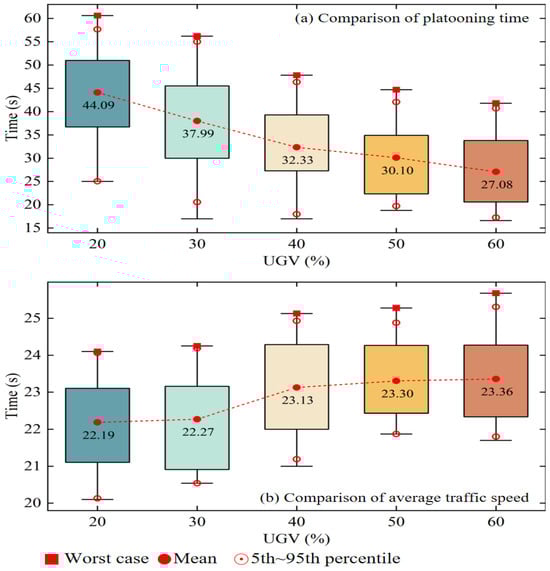 Figure 8b shows that as penetration increases from 20% to 60%, the average traffic speed improves from 22.19 m/s to 23.36 m/s, representing a 5.3% increase. These findings indicate that UGVs, due to their faster response to s-UGV maneuvers, facilitate platoon control more effectively than HDVs. Consequently, higher UGV penetration in the background traffic improves both platoon formation and overall traffic performance.