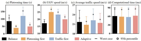 - Dedicated UGV lane with adaptive strategy: Based on the second experiment setting, the same dedicated lane is used, but platoon organization is enabled or disabled according to the flow-aware adaptive strategy.