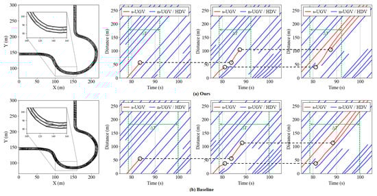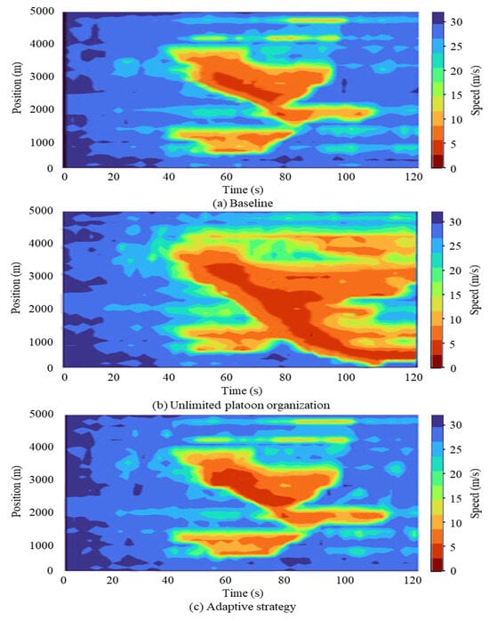 Figure 9 presents the speed heatmaps. Comparison of Figure 9a,b shows that unrestricted platoon organization leads UGVs to initiate catch-up maneuvers regardless of traffic conditions, significantly reducing speeds relative to the baseline. By contrast, comparison of Figure 9a,c reveals that the adaptive strategy produces a heatmap nearly identical to that of the baseline, confirming that selectively enabling platoon control according to traffic states avoids adverse impacts on traffic performance.
