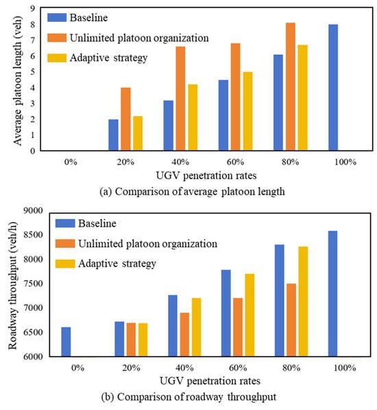 Comparison of average platoon length and roadway throughput under different UGV penetration rates.