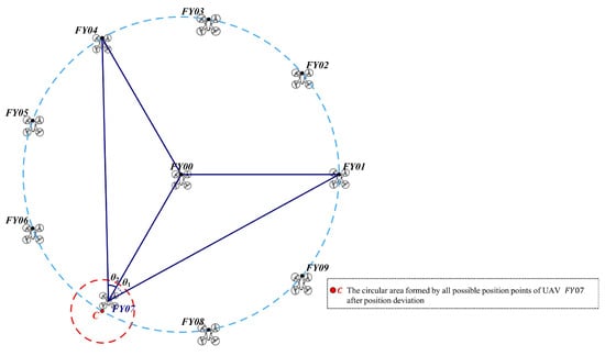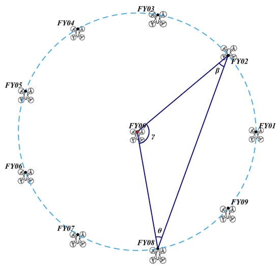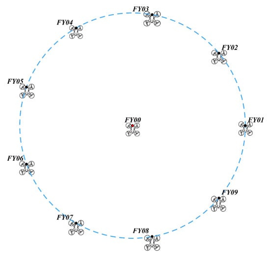 As shown in Figure 1, the drone formation studied in this paper consists of 10 drones arranged in a circular formation. Nine drones (numbered –) are evenly distributed along a circumference, while the remaining drone (numbered ) is positioned at the center of the circle. Each UAV maintains the same altitude based on its own altitude information. Within the formation, each UAV has its own number. Each UAV receives only angle information and the number of the UAV from which the signal originates, if known. The UAV formation must now adjust its position through signal transmission and reception to maintain the corresponding formation. Therefore, a model must be established to solve the following problem: