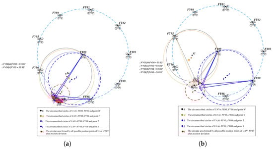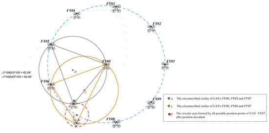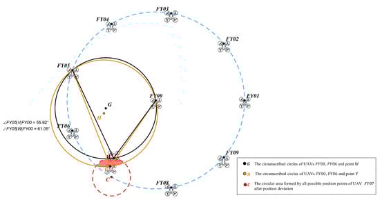 In trilateration localization model, let’s assume that the drone receiving the signal has the number . For different positions of the drone receiving the signal, the calculation results for are shown in Table 4. The counterclockwise numbering order in Table 4 is based on establishing polar coordinates with drone as the pole and the horizontal right direction as the polar axis. The corresponding counterclockwise sorting relationship of the drones is obtained based on the magnitude of the polar angles of drones , , and in the polar coordinates. According to assumption (1), for the drone that needs to confirm its own position, its location is distributed within centered at the correct position with a radius of . The size of the radius is related to the radius of the circular formation of the drones, where in this paper. Figure 3 illustrates the geometric relationship between the positioning calculation angles and when the counterclockwise numbering order of the drones serving as the transmission source is .