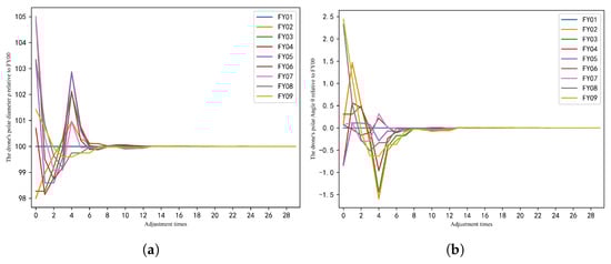 Finally, the coordinate changes of each UAV during the formation adjustment process under the two different algorithms are compared. Figure 30a,b show the variation of the polar radius for each UAV under the optimal adjustment scheme obtained by the GA algorithm and the GA-IADNS algorithm, respectively. Figure 31a,b show the variation of the polar angle for each UAV under the optimal adjustment scheme obtained by the GA algorithm and the GA-IADNS algorithm, respectively.