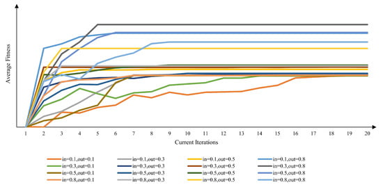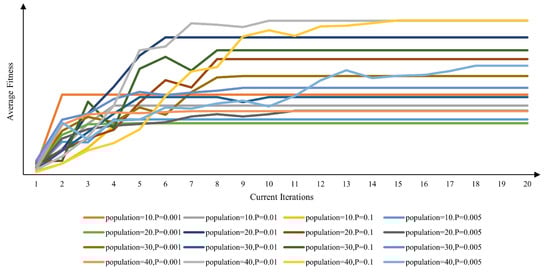 This study further investigates the average fitness variation of each generation during algorithm iteration under different combinations of population size and mutation probability parameters, as shown in Figure 25. It is similarly observed that when , the population exhibits higher fitness and faster convergence. However, it should be noted that while also yields high population fitness, its convergence rate is slower. The appropriate choice should be determined based on practical circumstances. The results further demonstrate that a moderate mutation rate combined with a medium population size strikes a crucial balance between algorithmic search capability and efficiency. This configuration enables the drone formation adjustment scheme to approach the optimal solution within fewer iterations. Consequently, this study selects and as the algorithmic parameter.