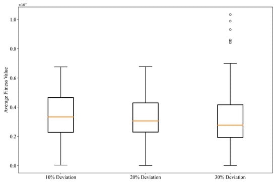 According to Figure 27, the larger the initial deviation, the lower the overall average fitness value during the algorithm’s iteration process. The deviation group exhibits the highest median fitness and the least fluctuation, while the deviation group shows the most dispersed fitness distribution. This indicates that with smaller initial deviations, the algorithm converges faster and demonstrates greater stability. However, it is also noted that GA-IADES converges under all three initial deviation conditions. Yet, larger initial deviations require more iterations, as they cause cumulative measurement errors in signal angle measurements, increasing the difficulty of searching for the optimal adjustment sequence. The results demonstrate that GA-IADES effectively handles formation adjustment problems with varying initial deviations, exhibiting optimal performance at small deviations () with high adjustment accuracy and rapid convergence.