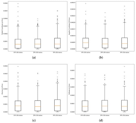 Figure 28(a), Figure 28(b), Figure 28(c), and Figure 28(d), respectively, show the statistical distributions of polar radius error, polar angle error, horizontal coordinate error, and vertical coordinate error between the final position and desired position of the UAV under different initial position deviations. As depicted in Figure 28, when the initial position deviation is , the deviation between the final position and desired position in both polar and Cartesian coordinates becomes negligible. Additionally, the median lines in the final error box plots for polar and Cartesian coordinates are close under different initial position deviation magnitudes, indicating consistent deviation correction accuracy across coordinate systems. It can be concluded that increased initial deviation only slightly affects the initial adaptation and error dispersion but does not significantly impact the final convergence accuracy, demonstrating the algorithm’s capability to handle a wide range of initial position deviations.