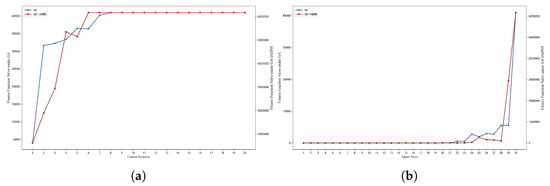 This study selected and to first investigate the magnitude of the average fitness value during algorithm iterations under different combinations of population size and mutation probability parameters. The results are shown in Figure 24a. It can be observed that the parameter combinations yielding higher fitness are and . Simultaneously, it is observed that when , fitness values are generally low, with only the population size showing relatively better performance. This can be attributed to the excessively low mutation probability leading to insufficient population diversity, causing the algorithm to easily get stuck in local optima. Conversely, when , fitness values increase with larger population sizes, yet remain overall lower than when . Thus, while high mutation rates enhance diversity, they may disrupt high-quality genes, leading to unstable convergence. At , fitness values peak significantly, especially at population sizes 20 and 40. This indicates that moderate mutation balances population diversity and convergence speed, enhancing global search capability. Similarly, for population size, small populations () exhibit the lowest overall fitness values and are sensitive to mutation probability, often resulting in limited search capabilities. Large populations () provide a richer gene pool, and when combined with moderate mutation rates, can steadily improve algorithm performance, but the algorithm’s runtime increases significantly. Medium populations () perform excellently at , but shows a decline in performance at , while ensures both algorithmic efficiency and result stability.