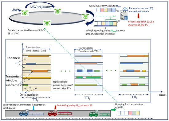 Figure 1 illustrates the uplink scenario of the UAV-assisted C-V2X communication model being studied, focusing on queuing and processing delays in uplink and downlink. It examines the implications of these delays on overall latency, throughput, and power optimization. By analyzing the effects of these delays on both power consumption and throughput, we evaluate how communication and power usage can be optimized in dynamic UAV-assisted vehicular networks [12]. This is achieved while addressing the stringent requirements of 6G applications within a federated learning environment. Here, each vehicle can transmit only within the transmit time interval (TTI) to the UAV. The packets are temporarily buffered in the in-vehicle queue, where they await scheduling and transmission over the communication channel [12]. Note that in a federated learning (FL) scenario, these data consist of processed local model parameters [13]. In gross data offloading scenario, the collected sensor data are buffered and directly transmitted to the UAV [14]. At the UAV, the incoming packets are queued until the embedded parameter server (PS) is available. This contributes to a second queuing delay at the UAV [15]. Furthermore, the FL scenario introduces additional processing delays due to the computation of global model parameters, which require aggregation and synchronization of locally trained models from a number of vehicles that gather non-i.i.d. data [12].