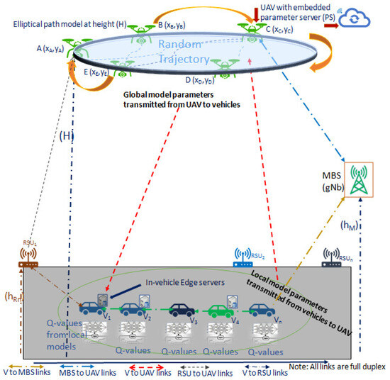 Figure 2 illustrates our proposed communication architecture where a cluster () consists of vehicles represented as , …, . The sensor data are processed at an in-vehicle edge server (ES), and a local model is generated, while the global model is aggregated and maintained at the UAV. Upon the UAV’s request, an ES transmits its processed local model to the UAV. Subsequently, the UAV identifies a subset of vehicles from the set , …, for further processing in each transmission window (). Upon arrival at the UAV, packets are either aggregated instantaneously or buffered in a queue for subsequent processing. To prevent the UAV from moving beyond the communication range of the vehicles, we restrict the UAV’s path to an elliptical path, as illustrated in Figure 2 and motivated by the findings in [41,42,43]. The UAV trajectory spans a spatial distribution of points that follow a Poisson distribution in the elliptical region at a predefined height (). The UAV’s capacity to serve vehicles is also partly determined by the available UAV transmission power () and .