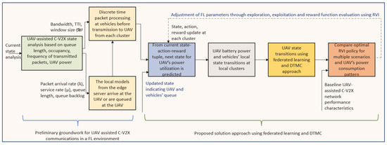 The paradigm of cellular vehicle-to-everything (C-V2X) communications assisted by unmanned aerial vehicles (UAVs) is poised to revolutionize the future of sixth-generation (6G) intelligent transportation systems, as outlined by the international mobile telecommunication (IMT)-2030 vision. This integration of UAV-assisted C-V2X communications is set to enhance mobility and connectivity, creating a smarter and reliable autonomous transportation landscape. The UAV-assisted C-V2X networks enable hyper-reliable and low-latency vehicular communications for 6G applications including augmented reality, immersive reality and virtual reality, real-time holographic mapping support, and futuristic infotainment services. This paper presents a Markov chain model to study a third-generation partnership project (3GPP)-specified C-V2X network communicating with a flying UAV for task offloading in a Federated Learning (FL) environment. We evaluate the impact of various factors such as model update frequency, queue backlog, and UAV energy consumption on different types of communication latency. Additionally, we examine the end-to-end latency in the FL environment against the latency in conventional data offloading. This is achieved by considering cooperative perception messages (CPMs) that are triggered by random events and basic safety messages (BSMs) that are periodically transmitted. Simulation results demonstrate that optimizing the transmission intervals results in a lower average delay. Also, for both scenarios, the optimal policy aims to optimize the available UAV energy consumption, minimize the cumulative queuing backlog, and maximize the UAV’s available battery power utilization. We also find that the queuing delay can be controlled by adjusting the optimal policy and the value function in the relative value iteration (RVI). Moreover, the communication latency in an FL environment is comparable to that in the gross data offloading environment based on Kullback–Leibler (KL) divergence.