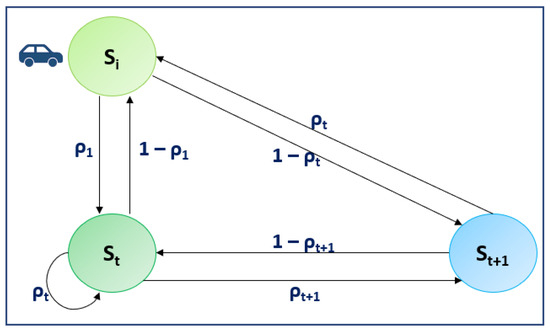 The sequence of packet transmissions is represented as state transitions, where each state corresponds to a specific iteration, along with the associated local model computation time, channel conditions, and transmission scheduling. The evolution of the vehicles’ local model parameters in Federated Learning (FL) is characterized by a Markov chain framework where each state of the local model represents its parameter configuration at a particular iteration. The transitions between successive states are governed by a transition probability matrix [26]. Therefore, our objective is to analyze the delay scenario in an FL environment using a Markov decision process. The present work builds upon and extends the findings reported in our previous study where we formulated FL as a Markov decision problem and optimized the model convergence rate.