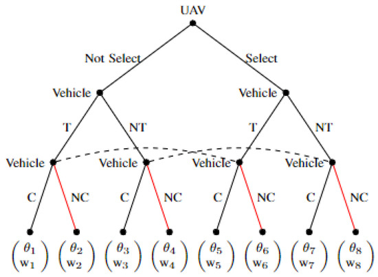 Figure 5 shows that the vehicle ES may take the following actions: local model completion (C), non-completion (NC), model transmission (T), or non-transmission (NT) to the UAV. The action set is described as = for various local models () in the transmission windows (). In Figure 5, the branch highlighted in implies that an action cannot be followed by an action T, i.e., a non-completed local model cannot be transmitted by the ES. The UAV can either select or not select a local update in each transmission window. Each action is a function of the pair , where
