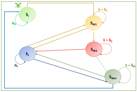 State transitions for UAV-embedded PS for a given packet arrival rate and initial state . A UAV state remains relevant only during the active transmission window , as restricted by constraints , , and .